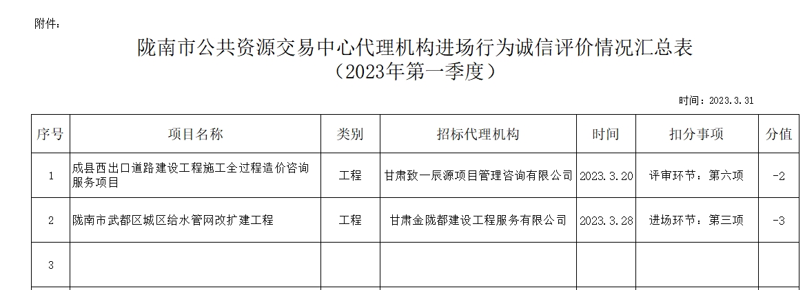 根據(jù)《甘肅省公共資源交易代理機(jī)構(gòu)管理辦法》(甘政辦發(fā)〔2019〕107號(hào))和《隴南市公共資源交易中心代理機(jī)構(gòu)進(jìn)場(chǎng)行為誠(chéng)信評(píng)價(jià)實(shí)施制度(試行)》規(guī)定,現(xiàn)對(duì)2023年第一季度,共2家代理機(jī)構(gòu)2條進(jìn)場(chǎng)行為誠(chéng)信評(píng)價(jià)記錄予以通報(bào)(詳見附表)。請(qǐng)各代理機(jī)構(gòu)嚴(yán)格遵守各項(xiàng)規(guī)章制度、誠(chéng)實(shí)守信,規(guī)范操作,為招標(biāo)人和采購人提供專業(yè)、高效、規(guī)范的招標(biāo)代理服務(wù)。