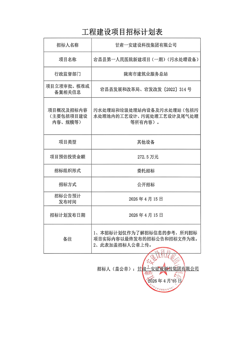 宕昌縣第一人民醫(yī)院新建項(xiàng)目(一期)(污水處理設(shè)備)